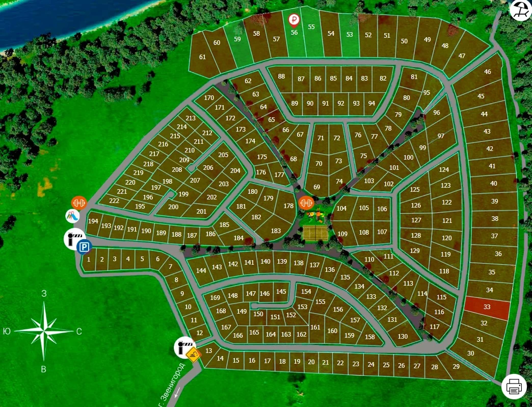 Поселок бизнес-класса в 8 км от Звенигорода. По границе поселка протекает Москва-река, есть собственный пляж, часть участков имеет выход к реке. Участки продаются с готовыми домами из газобетона площадью 127-279 кв.м. Несмотря на разнообразное внешнее оформление сохранена единая стилистика застройки. Кровли зданий обустроены таким образом, чтобы их можно было использовать.